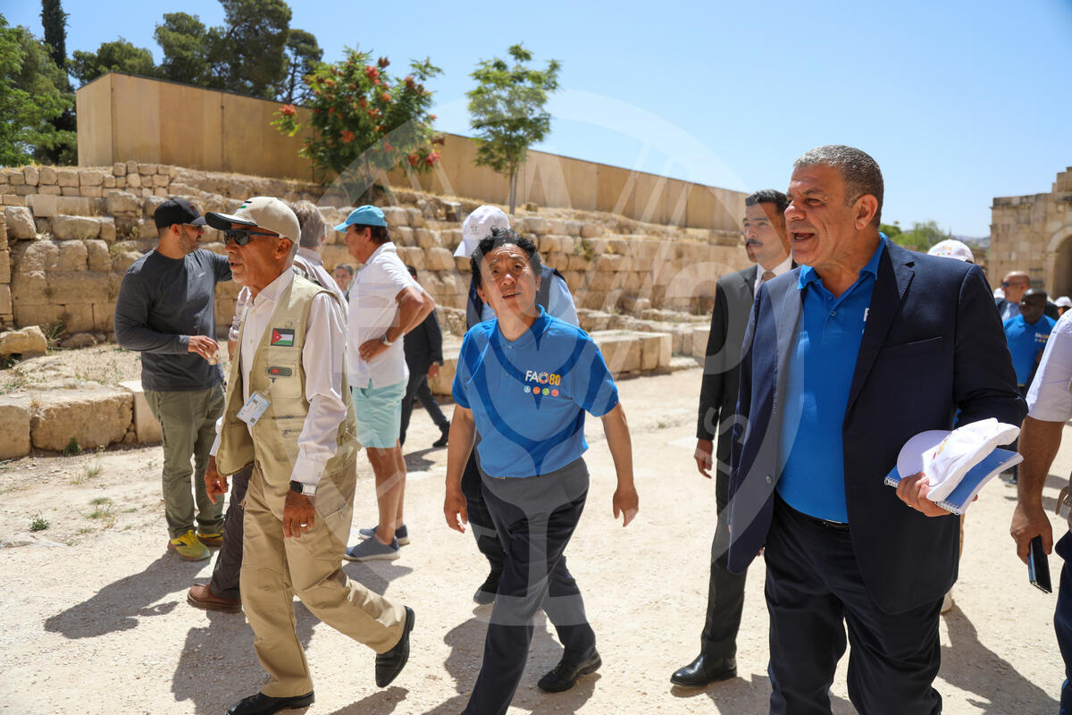 05 June 2025, Amman, Jordan. FAO Director-General QU Dongyu visits the ancient Roman city of Jerash, to explore the well-preserved monuments and Jordan’s rich cultural heritage.