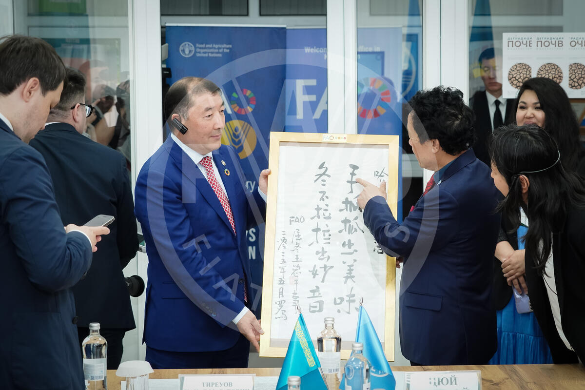 30 May 2025. Astana, Kazakhstan. FAO Director-General QU Dongyu (R) gives his calligraphy as a gift to Seifullin Kazakh, Rector of National Agrarian Research University during his visit at Seifullin Kazakh State Agrotechnical University.