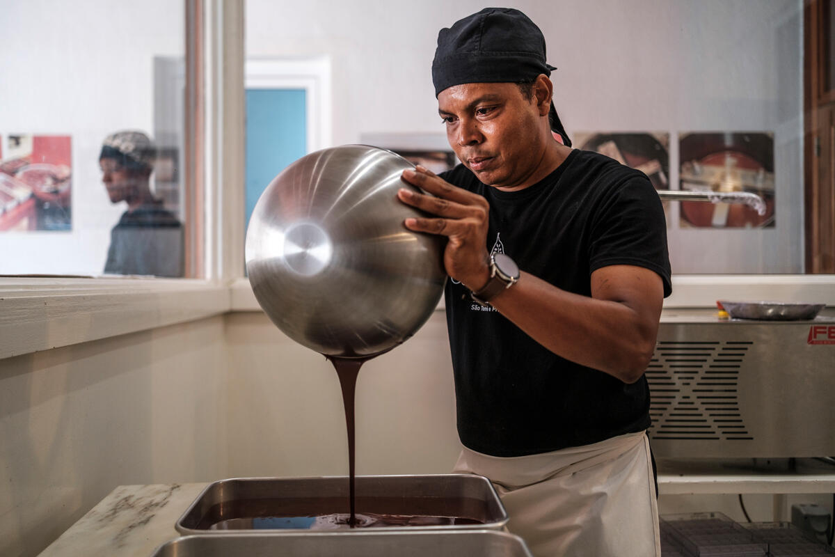 06 June 2025. Sao Tome, Sao Tome e Principe. Edner Jose Silva Dos Ramos, chocolatier and director, pours refined chocolate mass into a tray at the chocolate factory of Clocon Tela.