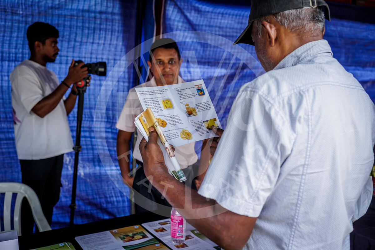 22 February 2025. Colombo, Sri Lanka. Visitors to the UNFAO booth at Sri Lanka’s first ever fruit festival, get information and fresh fruit.