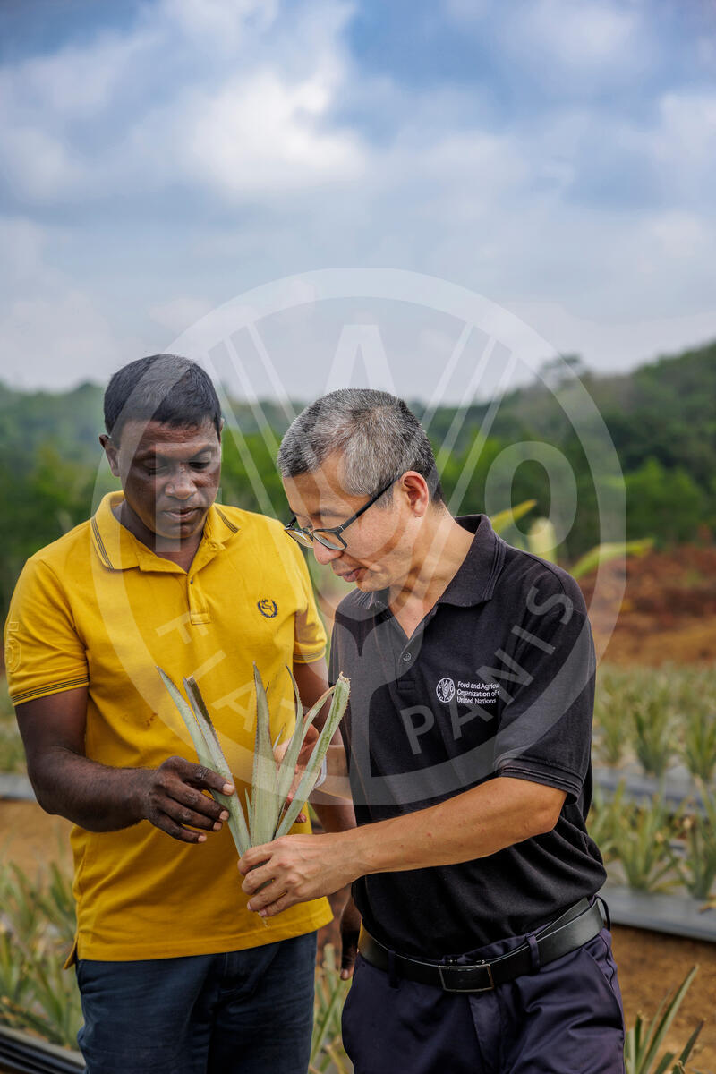 18 February 2025. Horana, Sri Lanka. BHS Lakmal (L), a pineapple farmer, inspects his crops, with Jifeng Li (R), a Chinese agriculture advisor who is providing Lakmal with expertise and Chinese technological support.