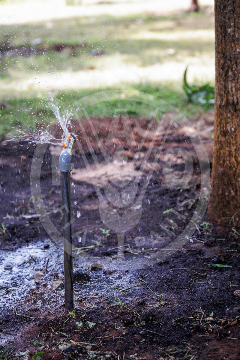 SRI LANKA, 2025. Water from irrigation system across growing mangoes