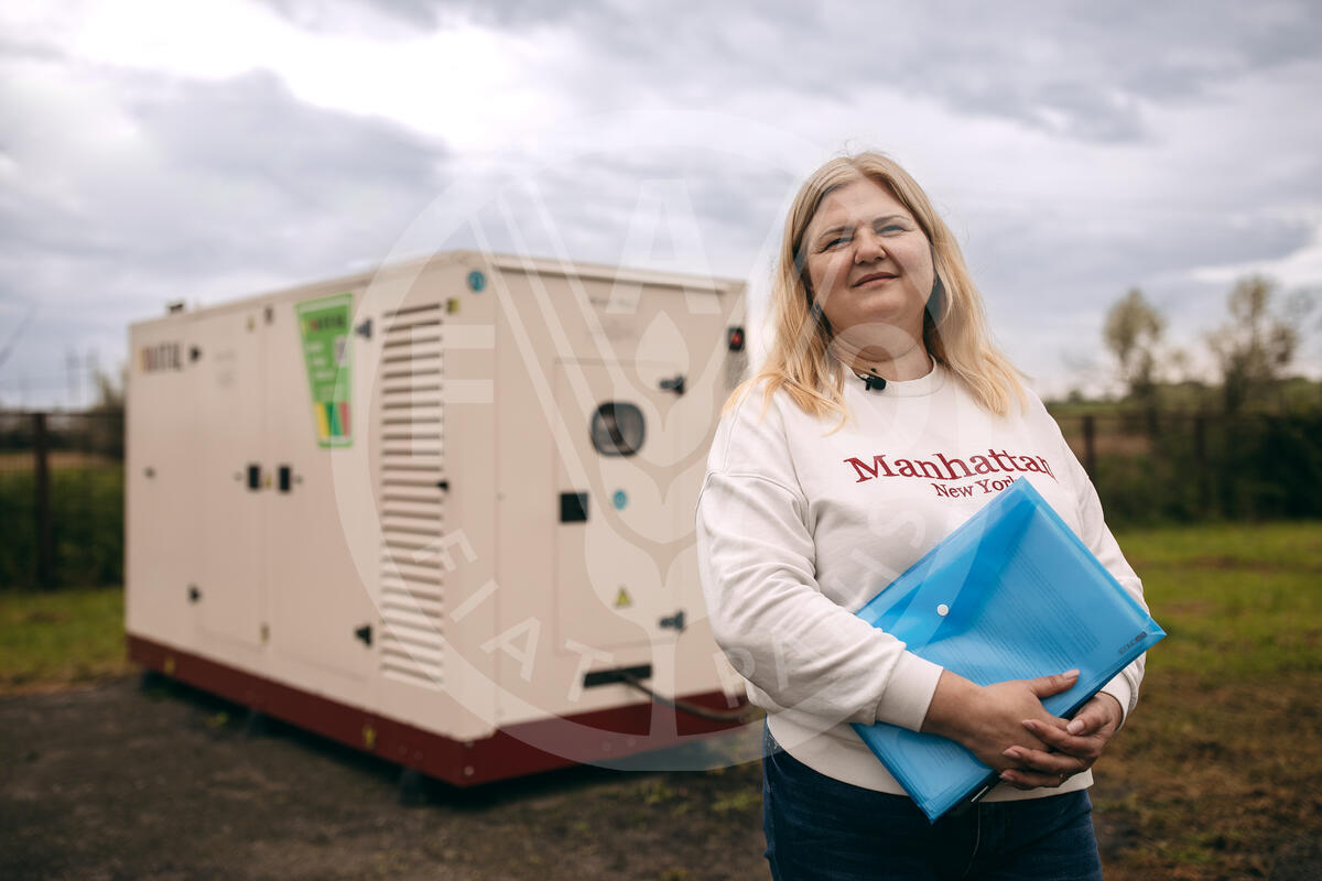 28 May 2025, Zaporizka oblast, Ukraine - Olena Hoshkoderia, Deputy Director of Mykilske Poultry Complex, next to the generator provided by FAO and Germany. Photo taken during visit of Rein Paulsen, Director of FAO’s Office of Emergencies and Resilience, to Zaporizka oblast, Ukraine.