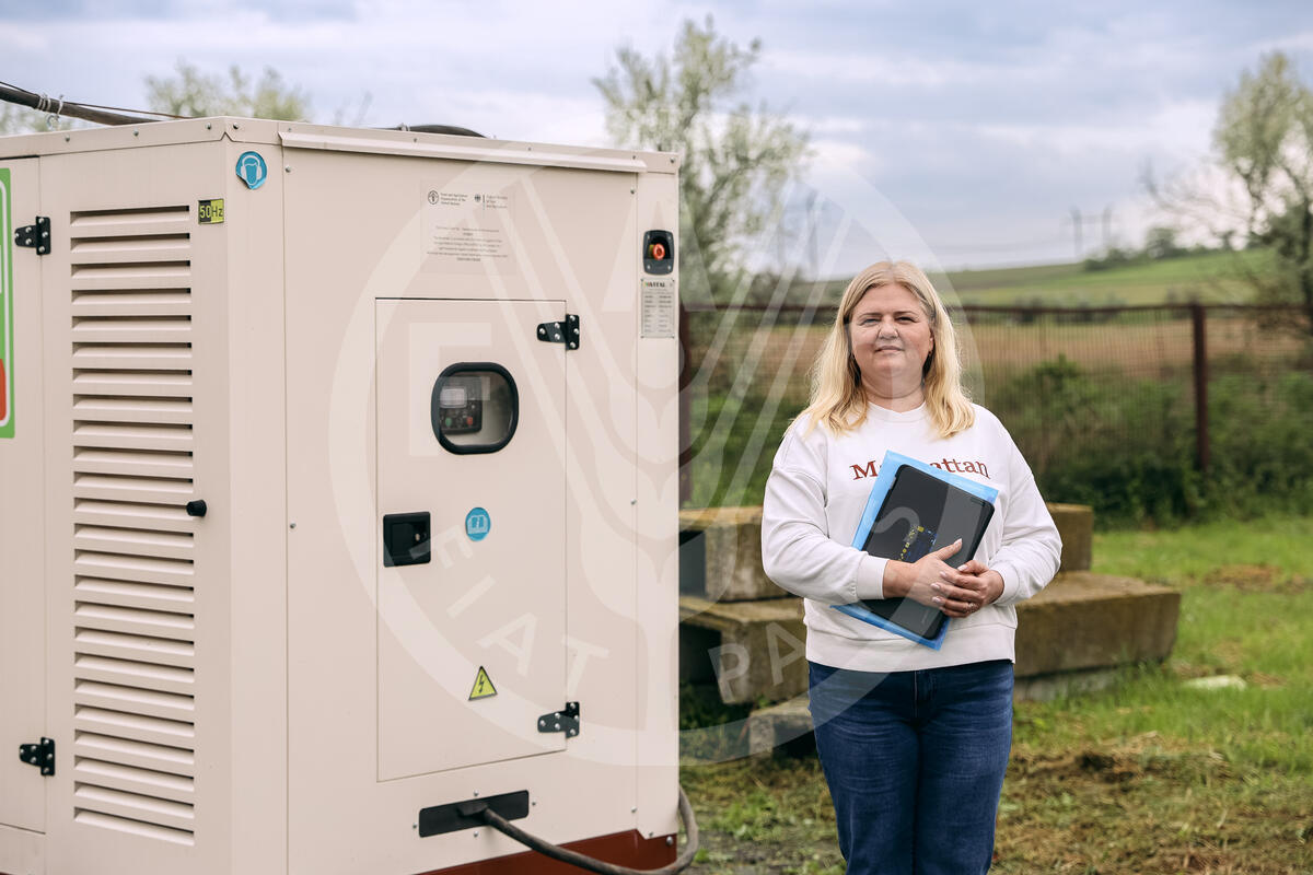 28 May 2025, Zaporizka oblast, Ukraine - Olena Hoshkoderia, Deputy Director of Mykilske Poultry Complex, next to the generator provided by FAO and Germany. Photo taken during visit of Rein Paulsen, Director of FAO’s Office of Emergencies and Resilience, to Zaporizka oblast, Ukraine.