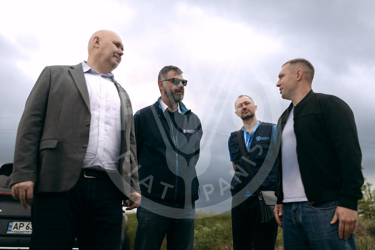 28 May 2025, Zaporizka oblast, Ukraine - (L-R) Rein Paulsen, Director of FAO’s Office of Emergencies and Resilience, Mohammed Azouqa, Head of the FAO Office in Ukraine a.i., Oleksandr Skorobohatko, National Project Specialist (FAO Ukraine), Artem Kalnysh, farmer from Zaporizka oblast, at the Terra-Viktoriia farm.