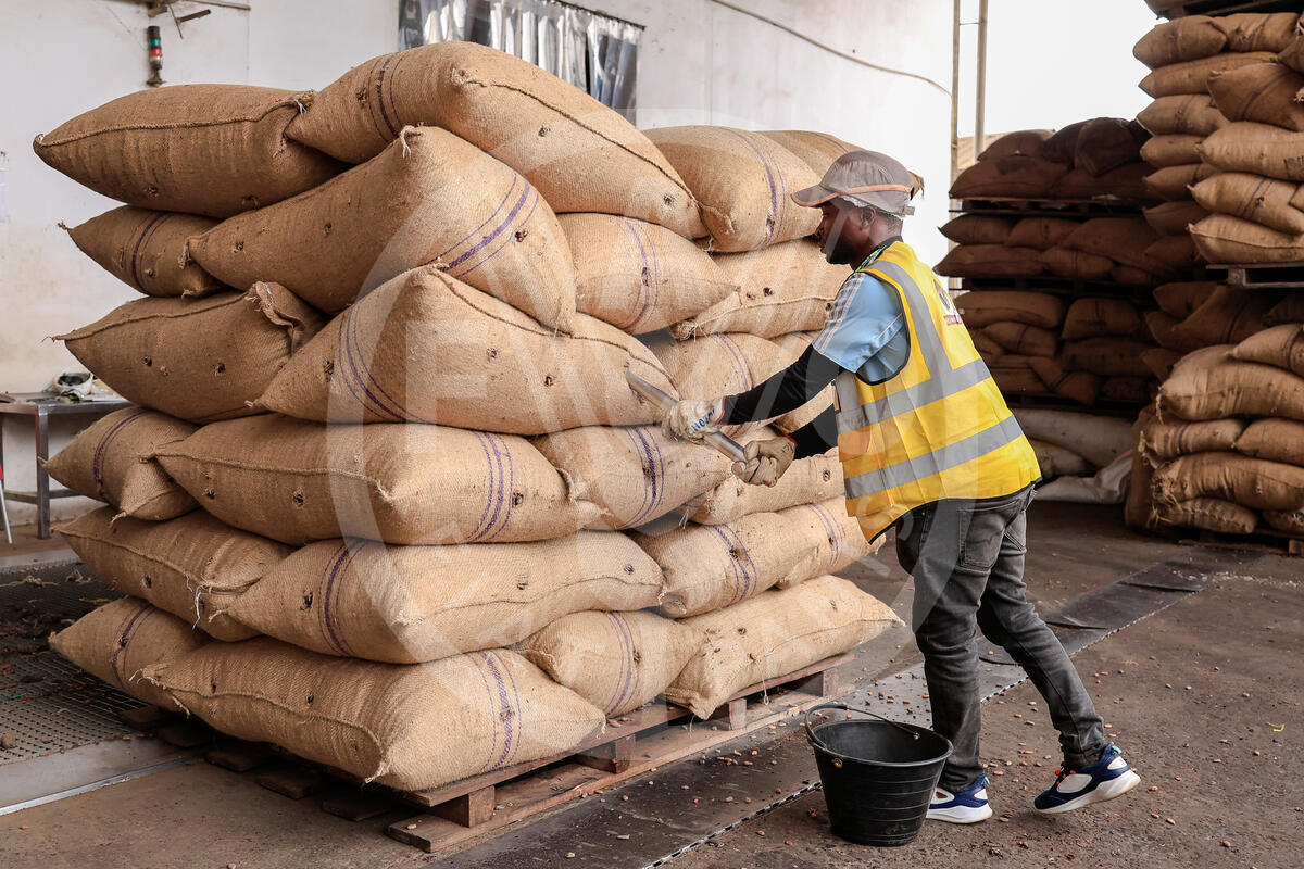 21 August 2025. NEO Industry SA, Kekem. Extraction of cocoa beans from the bags.