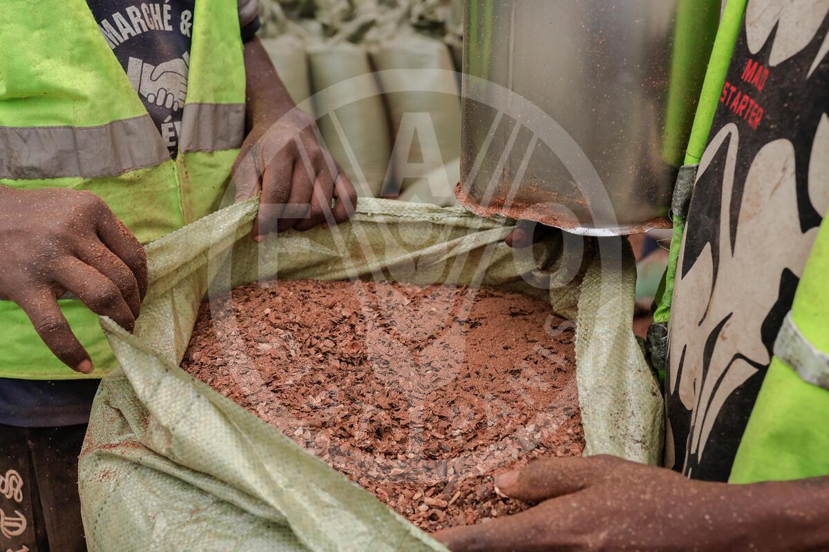 21 August 2025. NEO Industry SA, Kekem. Two workers showing the content of the cocoa by-product bags.