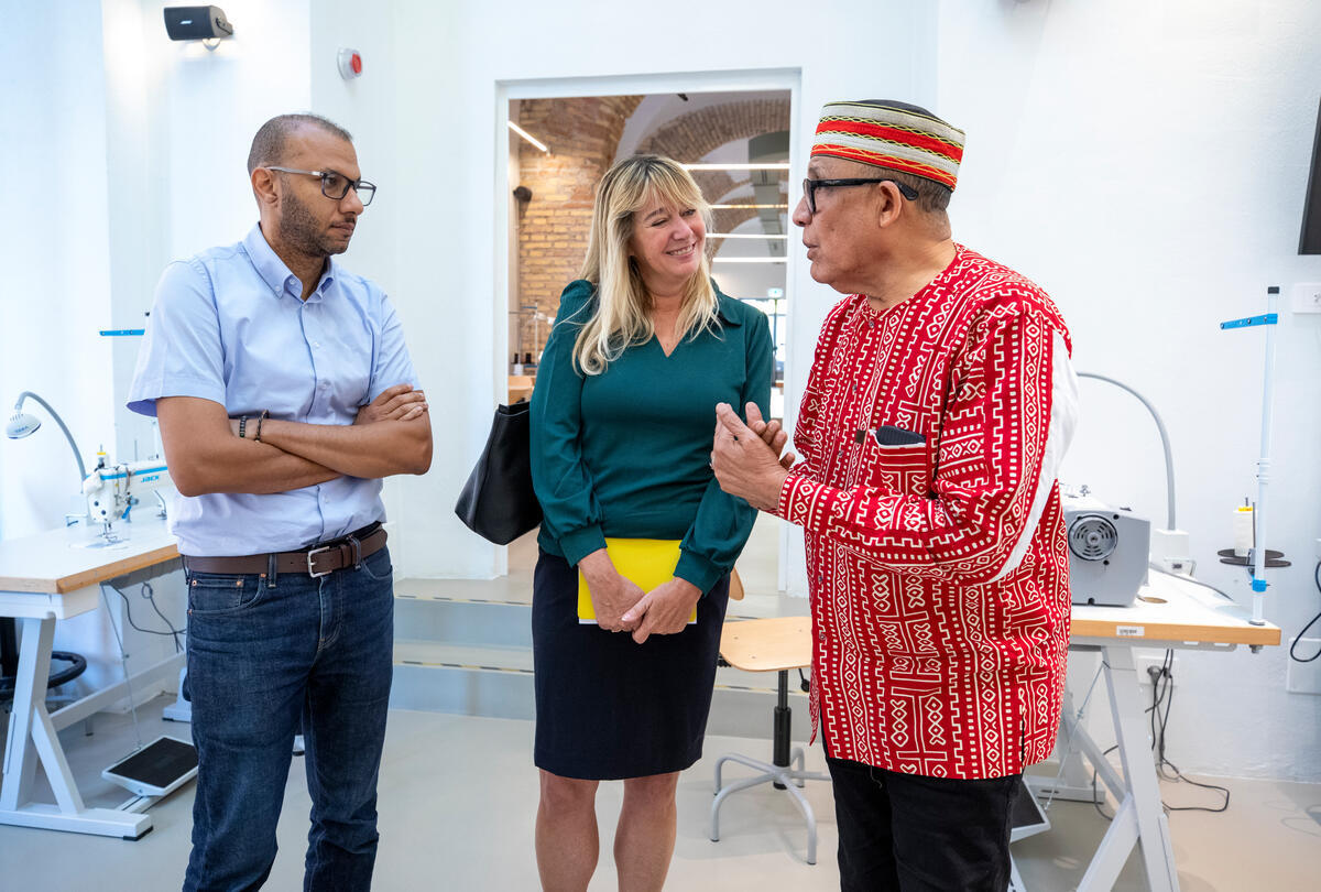 29 September 2025, Rome, Italy - (L to R) Mamoun Amrouk, Senior Economist, Markets and Trade Division, Kimberly Sullivan, FAO, Alphadi. Designer Alphadi visiting 'Accademia Costume & Moda', Roma.