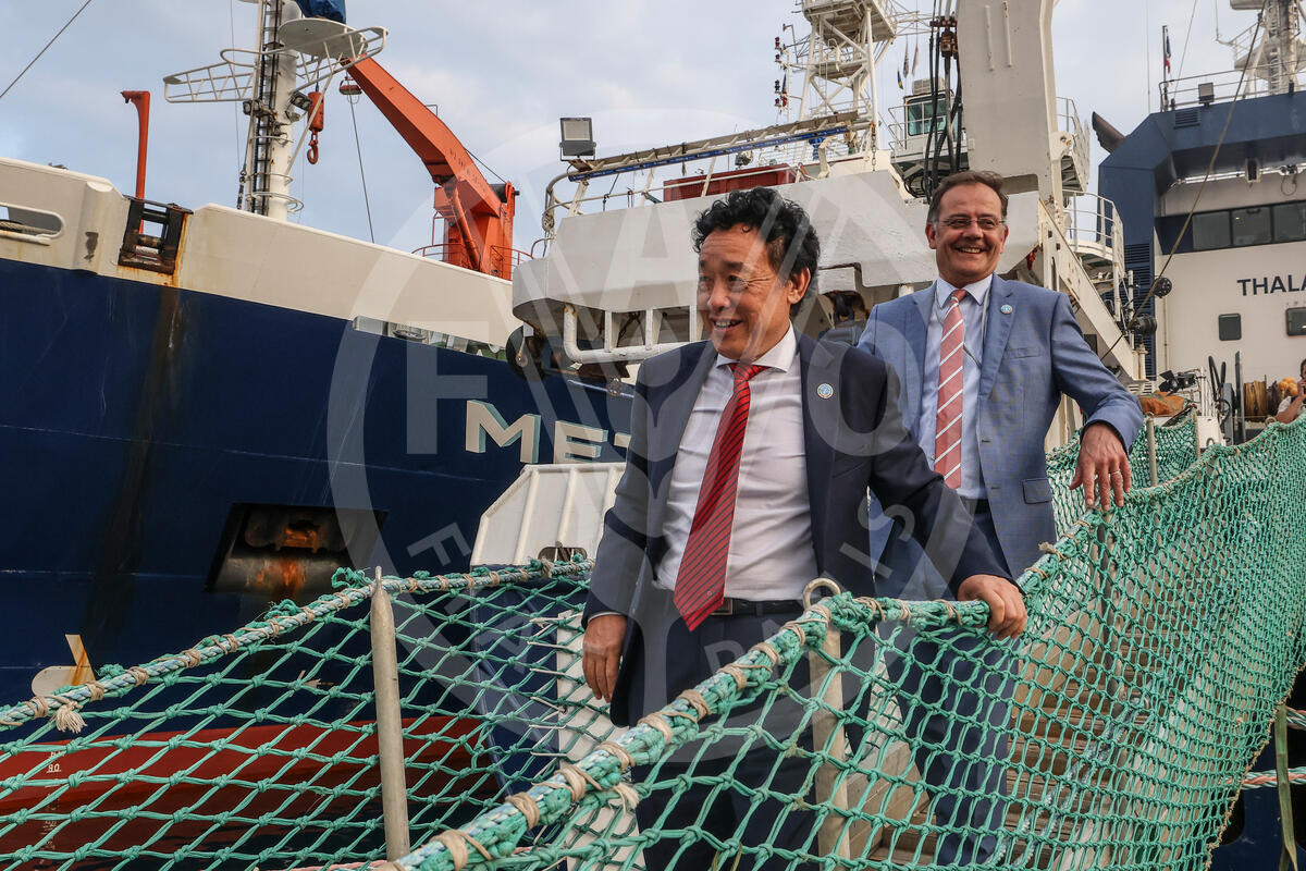 09 June 2025, Nice, France. FAO Director-General QU Dongyu, and FAO ADG Manuel Barange leave the Thalassa Vessel at the end of the From science to platter event (Thalassa Vessel).