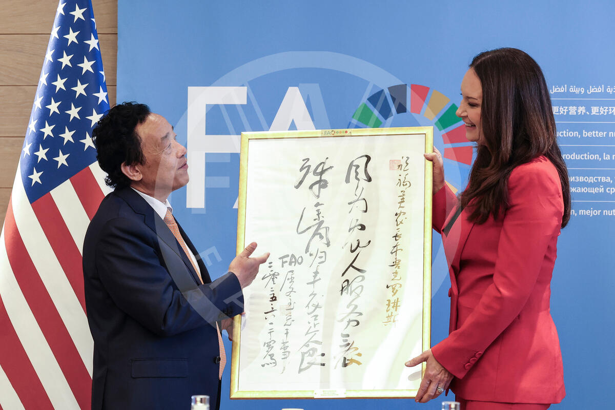 03 June 2025, Rome, Italy. FAO Director-General QU Dongyu (L) presents a chinese calligraphy as gift to USDA Secretary Brooke Rollins (R) following their bilateral meeting. FAO Headquarters (Australia Room).