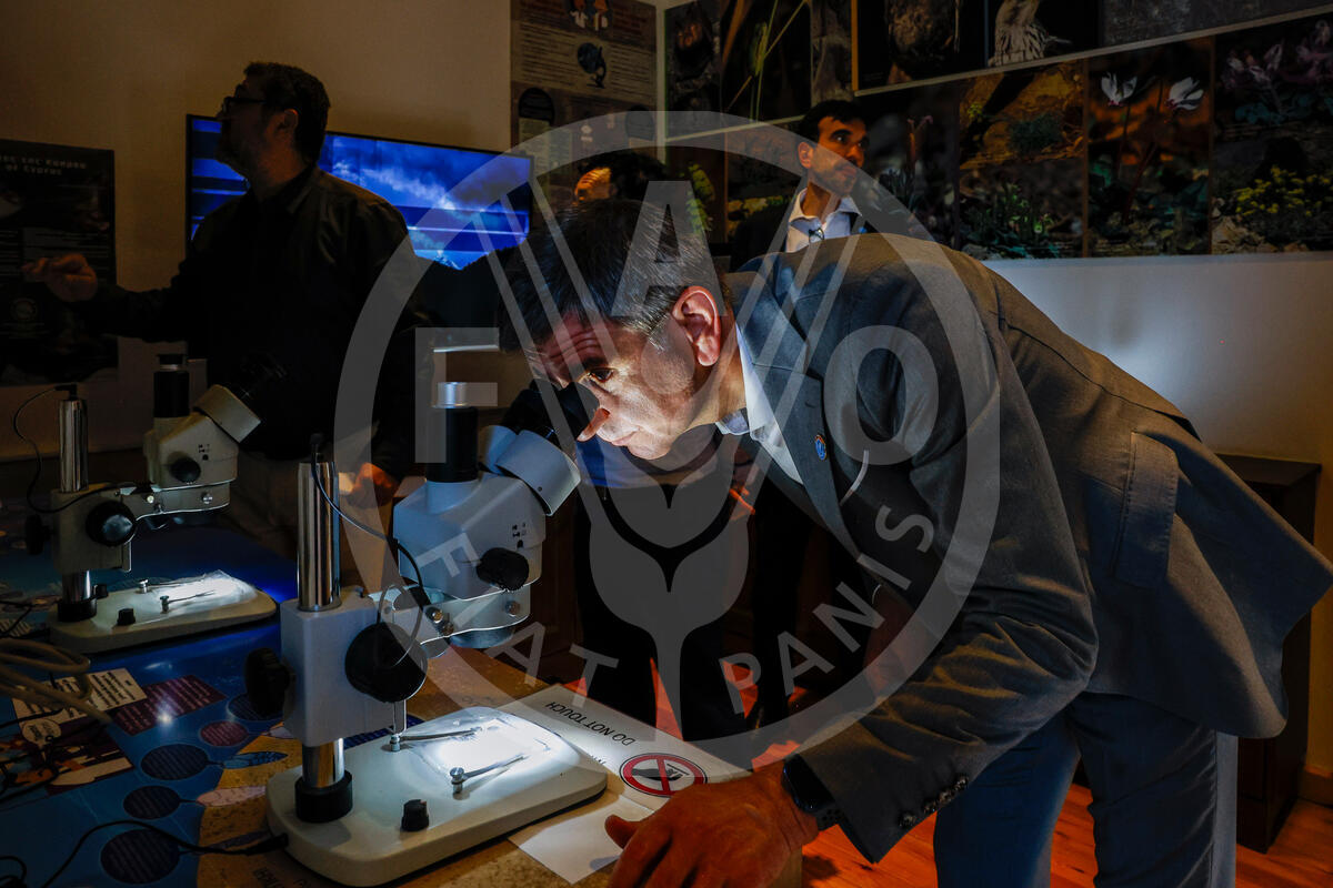 06 June 2025. Troodos mountain, Cyprus. Viorel Gutu, Assistant Director-General Regional Representative for Europe and Central Asia looks minerals under a microscope during his visit at UNESCO Global Geopark.