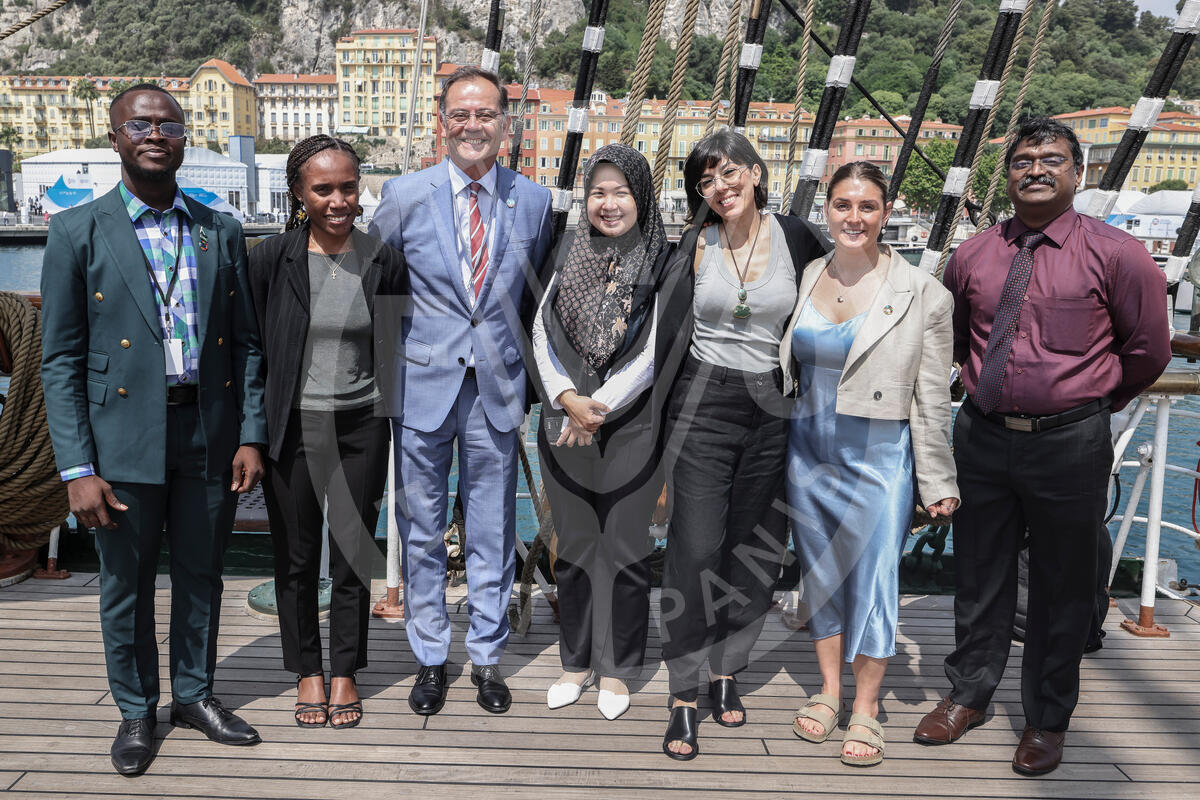 09 June 2025, Nice, France. FAO ADG Manuel Barange (3rd from L) poses for a group photo with young representatives of the fisheries and