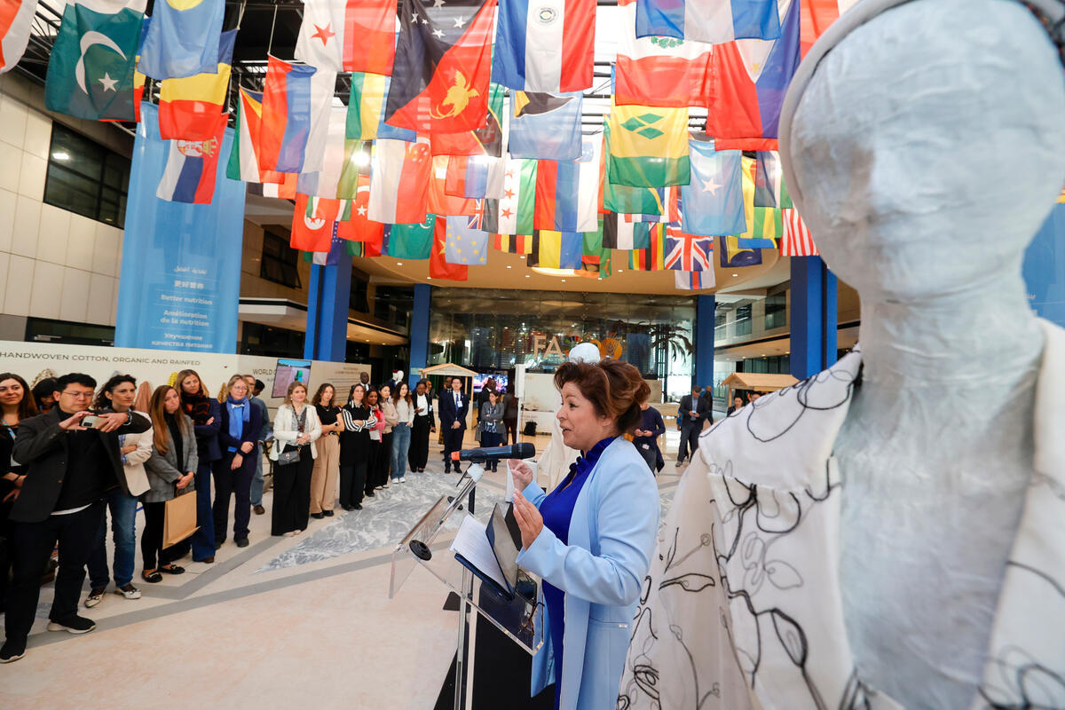 07 October 2025, Rome, Italy. Araceli Cardenas, FAO Communications Specialist, EST, talks to the attendees of the World Cotton Day 2025. FAO headquarters, (Atrium).