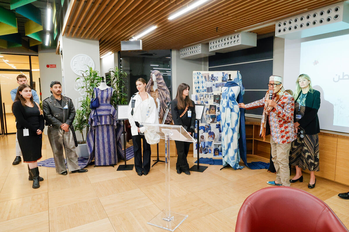 07 October 2025, Rome, Italy. Sidahmed Alphadi Seidnaly, fashion designer, (R) introduces students and their fashions creations during the Showcase segment: Cotton in Design and Innovation” on the World Cotton Day 2025. FAO headquarters, (Iraq Room).