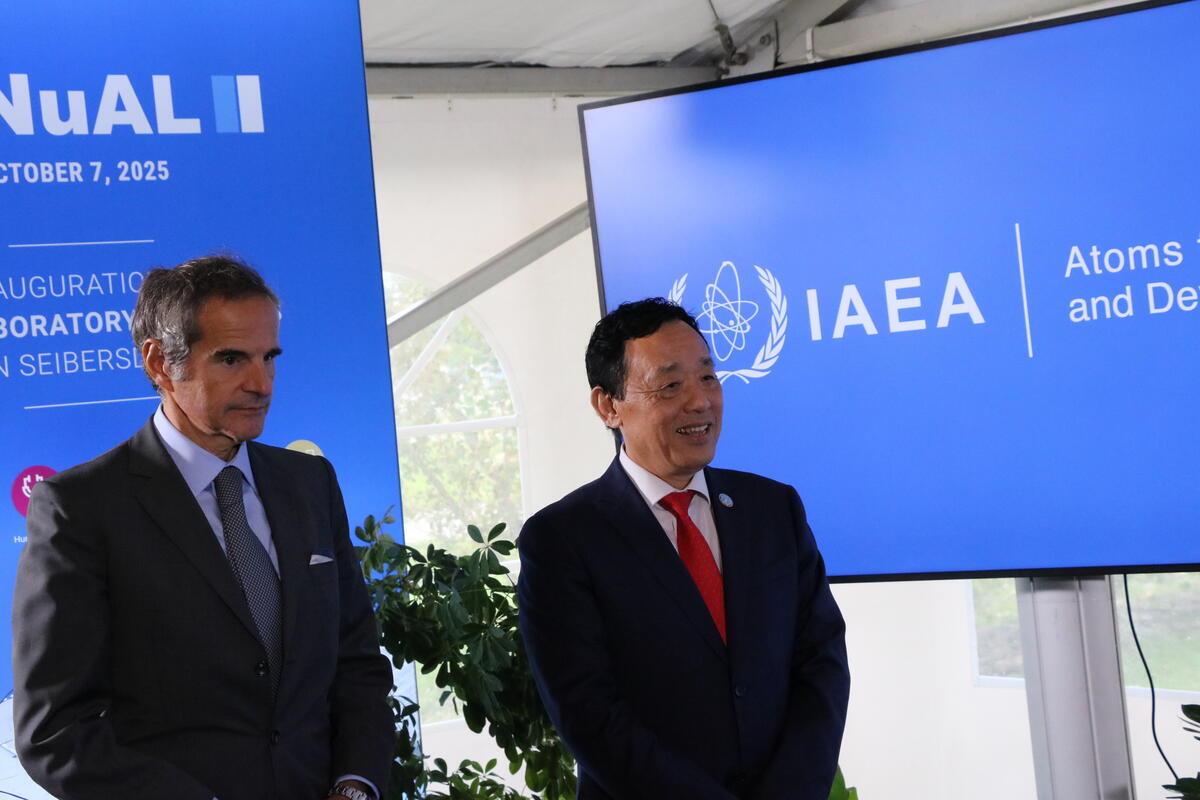 07 October 2025 Seibersdorf, Austria. FAO Director-General QU Dongyu (R) stands next to IAEA DG Rafael Mariano Grossi at the IAEA inauguration ceremony of new laboratories at Seibersdorf.