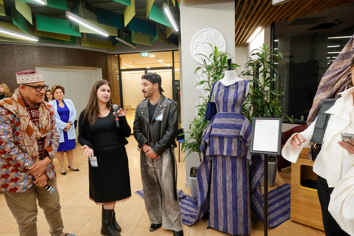 07 October 2025, Rome, Italy. Sidahmed Alphadi Seidnaly, fashion designer, (L) introduces students and their fashions creations during the Showcase segment: Cotton in Design and Innovation” on the World Cotton Day 2025. FAO headquarters, (Iraq Room).
