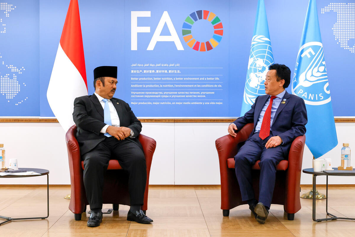 10 October 2025, Rome, Italy. FAO Director-General QU Dongyu (R) sits during his meeting with Indonesia Minister for National Development Planning/Chairman of BAPPENAS Rachmat Pambud. FAO headquarters, (Iraq Room).