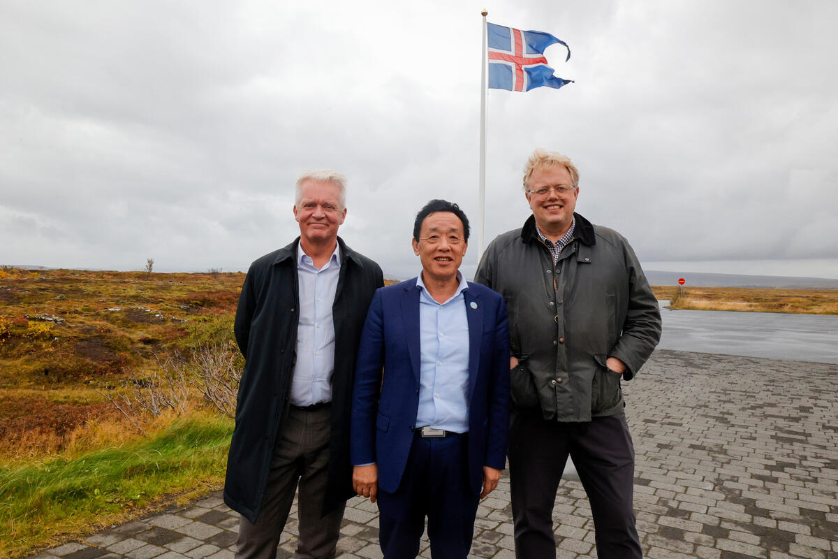25 September 2025, Thingvellir National Park, Iceland. FAO Director-General QU Dongyu (C) stands next to Einar Sæmundsson, Thingvellir National Park Director (R) and Guỗmundur Árnason, Ambassador and Permanent Representative of Iceland to the UN Rome Based Agencies at the end of his visit to the Park.
