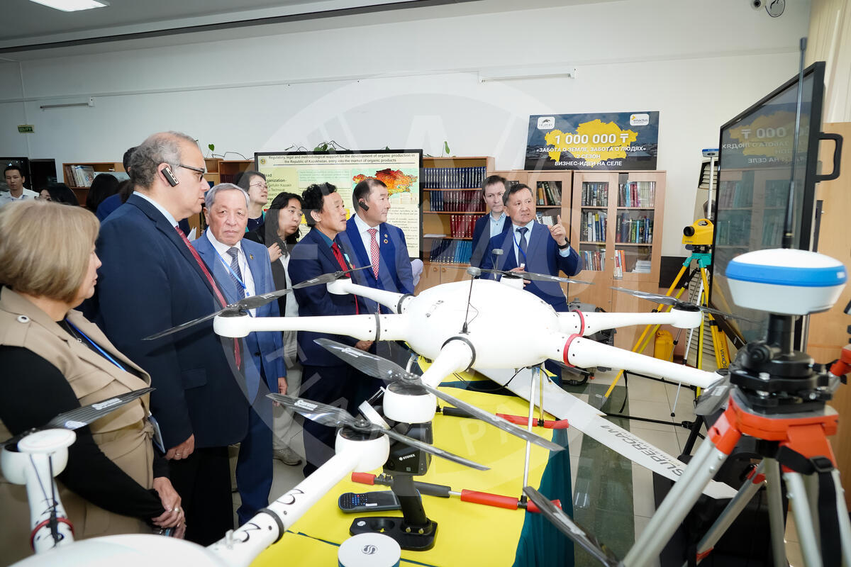 30 May 2025. Astana, Kazakhstan. FAO Director-General QU Dongyu accompanied by Seifullin Kazakh (fourth from left), Rector of National Agrarian Research University and his delegation listen to presentations of projects by young scientists and startups, including one in the field of potato breeding, in conjunction with World Potato Day, 30 May.