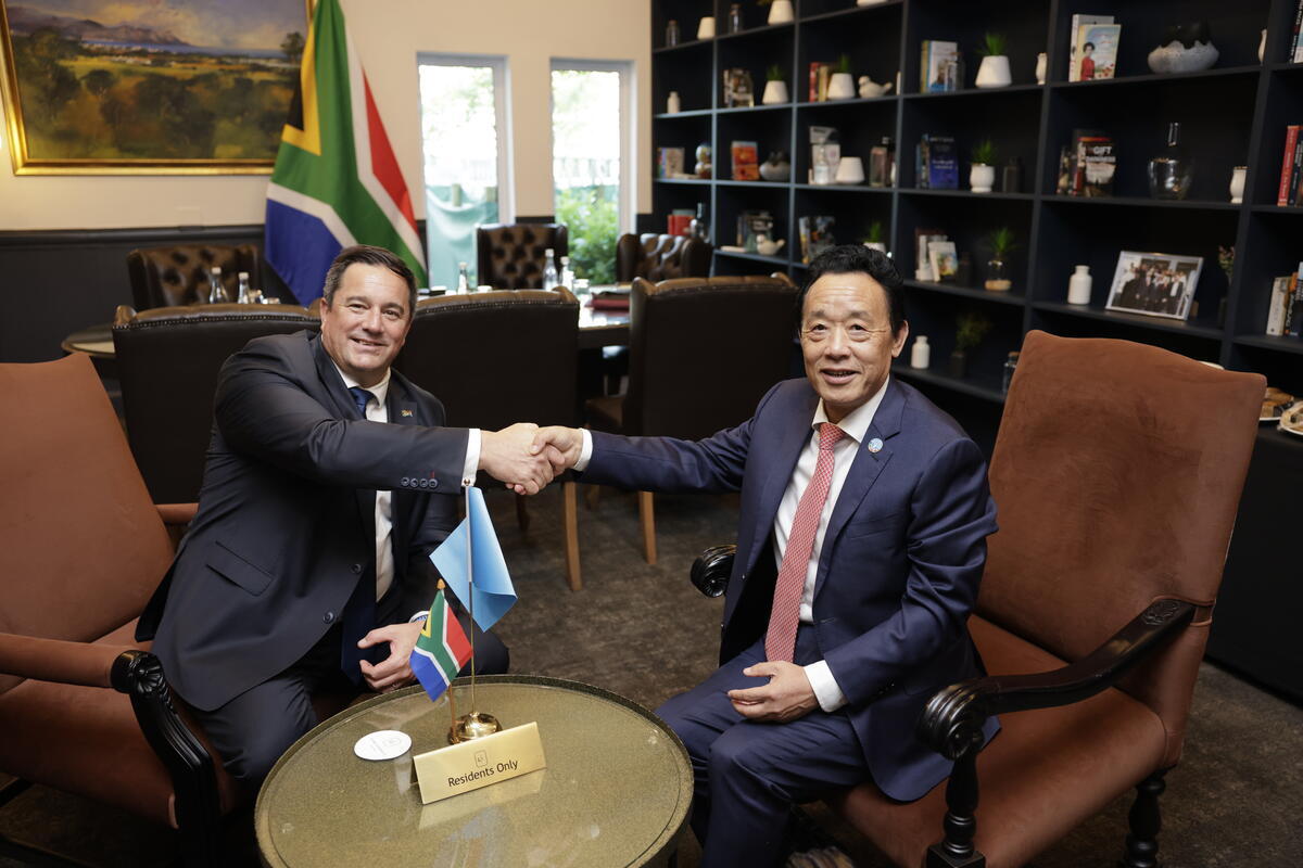 18 September 2025, Cape Town, South Africa. FAO Director-General QU Dongyu (R) shakes hands with South African Agriculture Minister John Steneehusen during their bilateral meeting at the G20 Agriculture Working Group Ministerial Meeting at the Lord Charles Hotel in Somerset West.