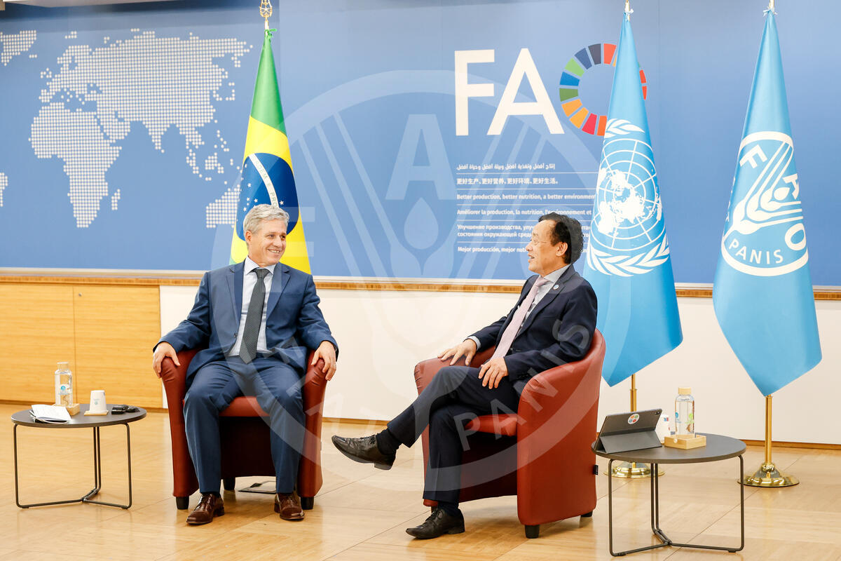 03 July 2025. Rome, Italy. FAO Director-General QU Dongyu meets Brazil Minister for Agrarian Development and Family Agriculture, Luiz Paulo Teixeira. FAO headquarters, (Iraq room).