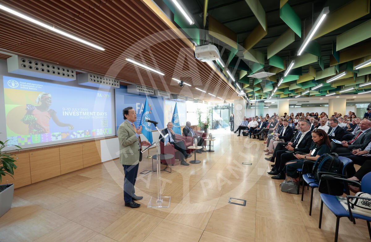 09 July 2025, Rome, Italy. FAO Director-General QU Dongyu. FAO Investment Centre's Investment Days. FAO Director-General Welcome remarks. FAO Headquarters (Iraq Room).
