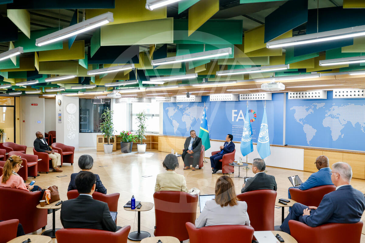 03 July 2025. Rome, Italy. FAO Director-General QU Dongyu meets Solomon Islands Minister for Agriculture and Livestock, Franklyn Derek Wasi. FAO headquarters, (Iraq room).