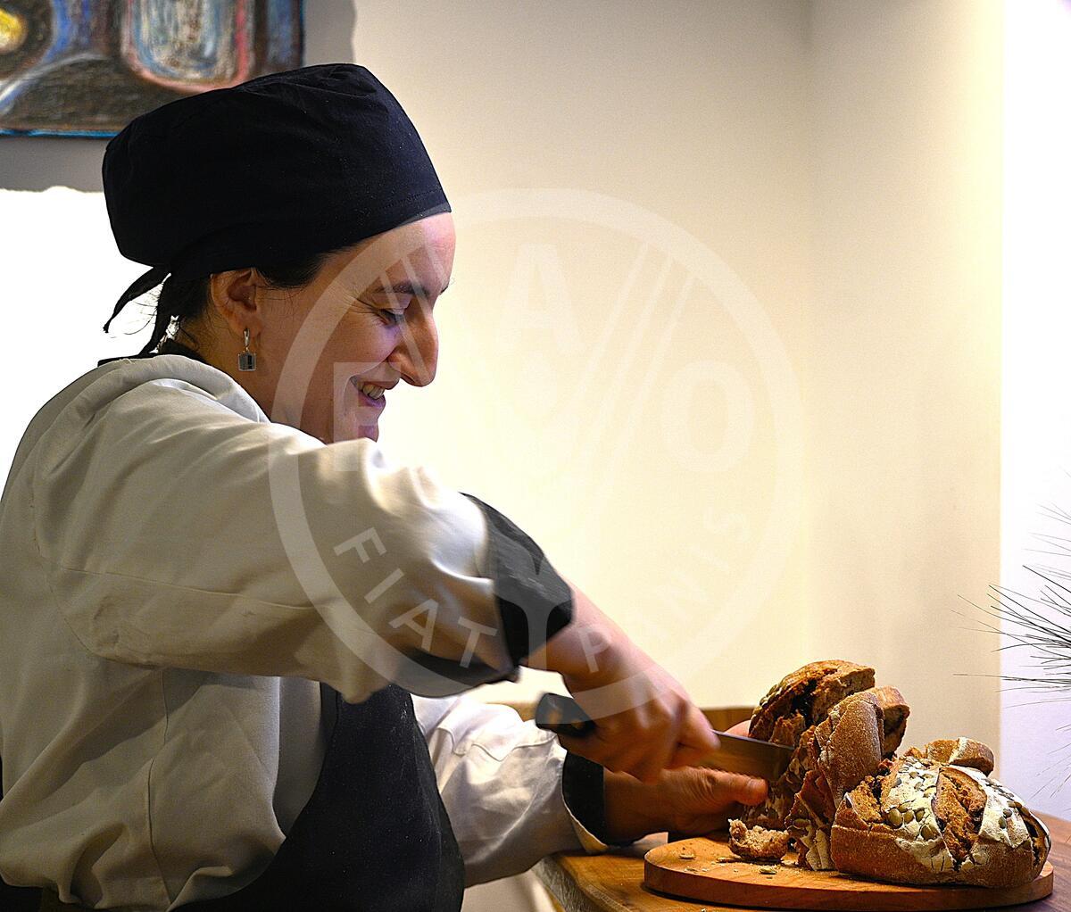 May 2025, Tbilisi, Georgia — Farmer and baker Natia Mathcharashvili cuts some freshly baked bread made from traditional Georgian wheat grown in her own field.