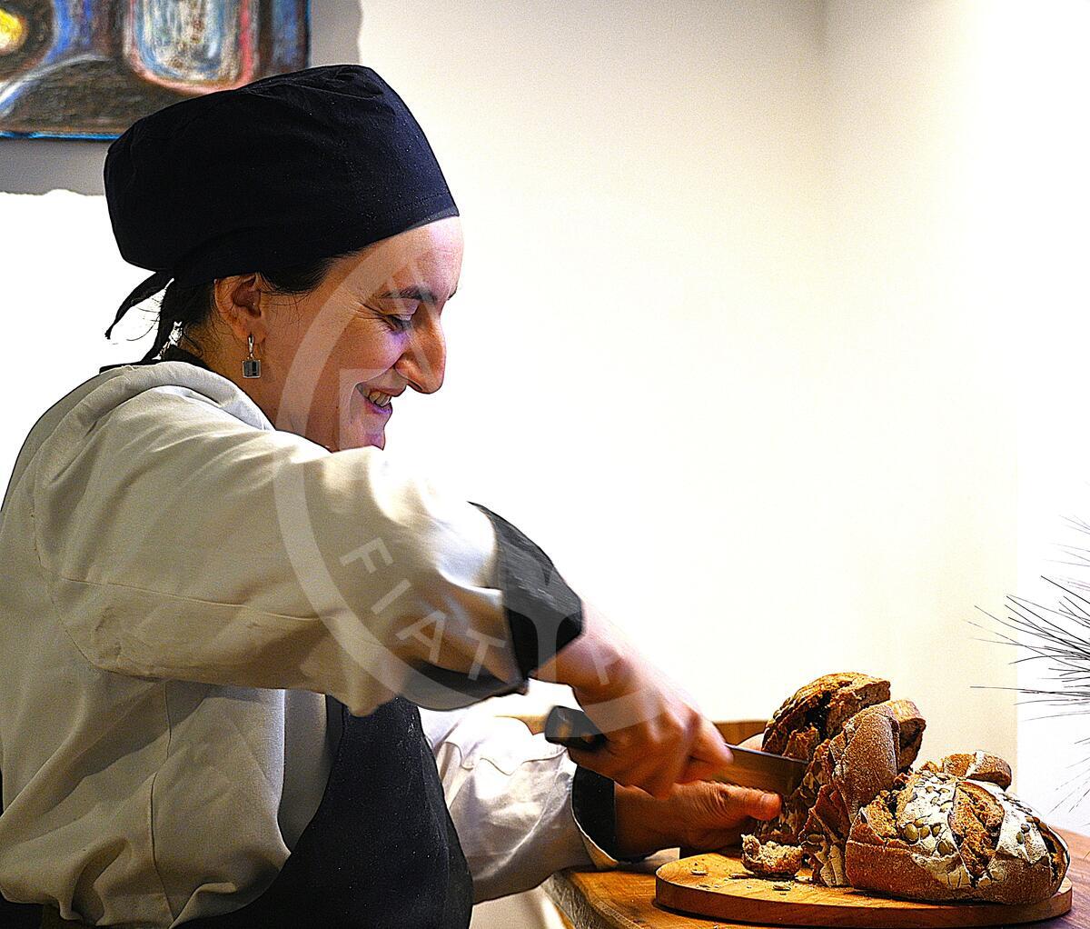May 2025, Tbilisi, Georgia — Farmer and baker Natia Mathcharashvili cuts some freshly baked bread made from traditional Georgian wheat grown in her own field.