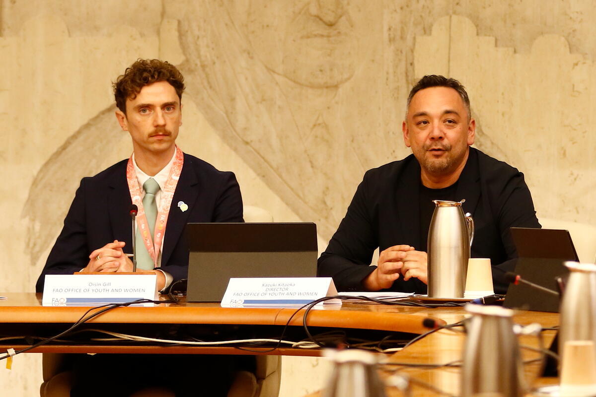 15 October 2025. FAO Headquarters, Rome, Italy. Mr. Kazuki Kitaoka (R), Director, Office of Youth and Women, FAO, and Mr. OisÃn Gill (L), Office of Youth and Women, FAO, attend the session dedicated to the global launch of the Global Teach Ag Network Community during the World Food Forum (WFF) 2025.
