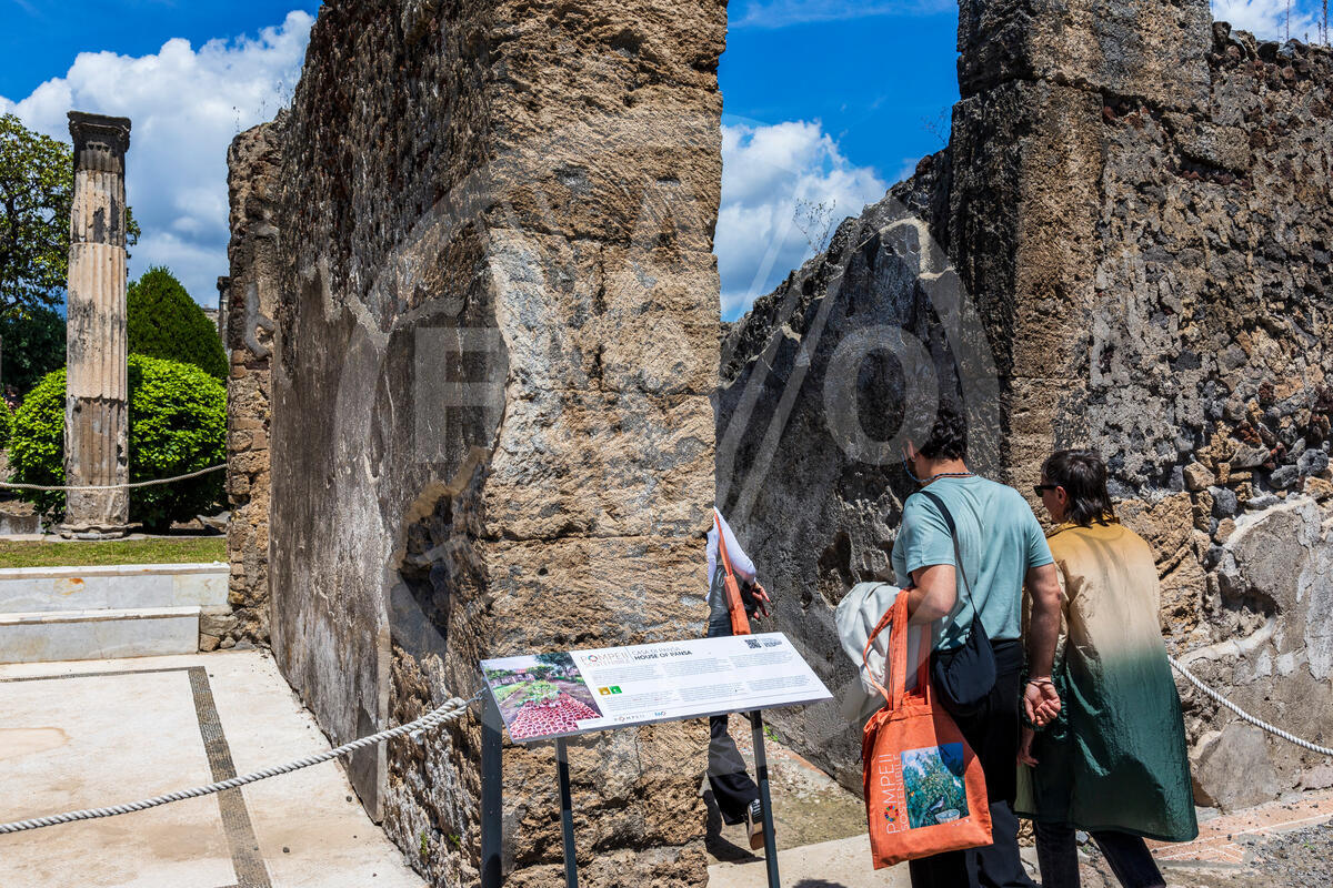 22 May 2025. Pompeii, Italy. A totem installed at the "House of Pansa" of Pompeii site, built as part of the “Sustainable Pompeii” project, created by FAO in collaboration with the Archaeological Park of Pompeii and the Italian Ministry of Foreign Affairs and International Cooperation (MAECI). Archaeological Park of Pompeii (House of Pansa).
