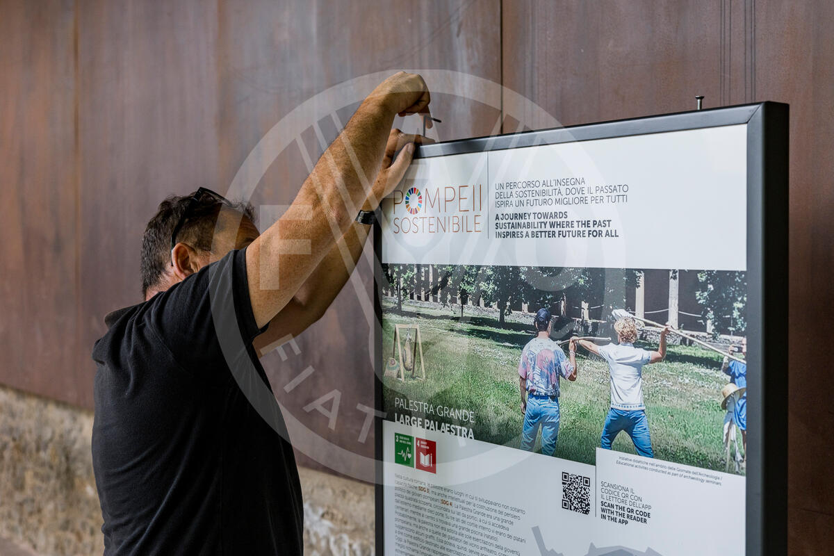 15 May 2025. Pompeii, Italy. Workers install totems in Pompeii site, built as part of the “Sustainable Pompeii” project, created by FAO in collaboration with the Archaeological Park of Pompeii and the Italian Ministry of Foreign Affairs and International Cooperation (MAECI).