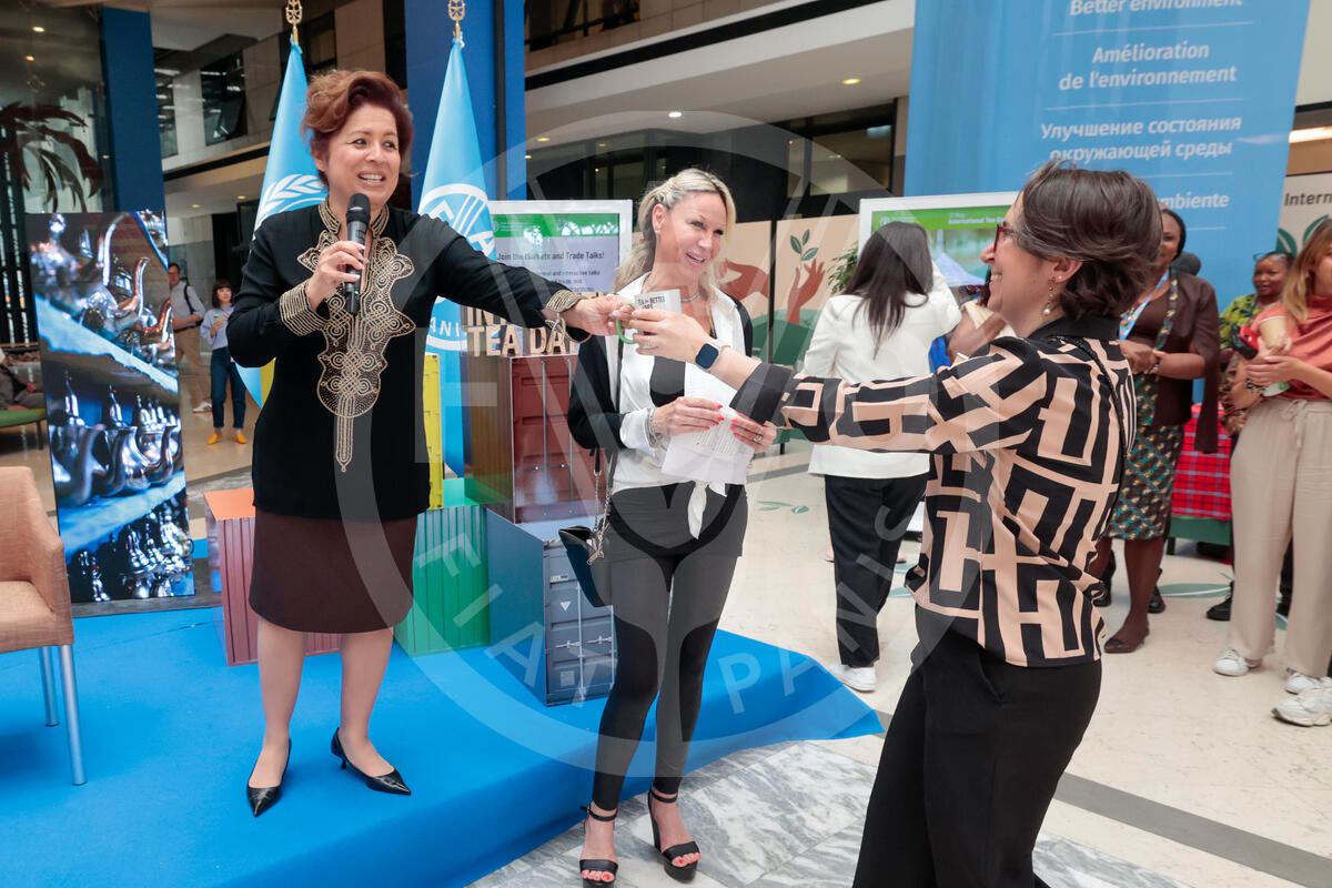 21 May 2025. Rome, Italy. Araceli Cardenas, FAO Communications Specialist, EST. hands over a tea mug to a staffer who answered a question about the use of tea in the world during the event “Teas from Around the World – Country Spotlights - (Kenya, Morocco, the Russian Federation)”, part of the celebration for the International Tea Day 2025. FAO headquarters, (Atrium).