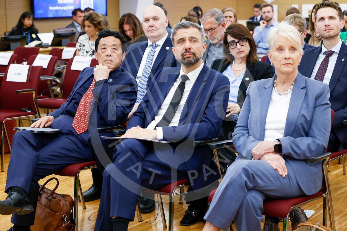 16 May 2025. Rome, Italy. FAO Director-General QU Dongyu (L), sits next to Alvaro Lario, President, International Fund for Agricultural Development (IFAD), and Cindy McCain, (R), Executive Director, World Food Programme (WFP), during the High-level Event to release the Global Report on Food Crises 2025 at the IFAD headquarters.