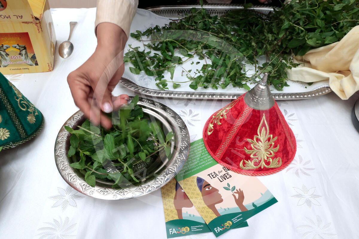 21 May 2025. Rome, Italy. A member of the moroccan delegation prepares mint to be used for tea during the celebration of the International Tea Day 2025. FAO headquarters, (Atrium).