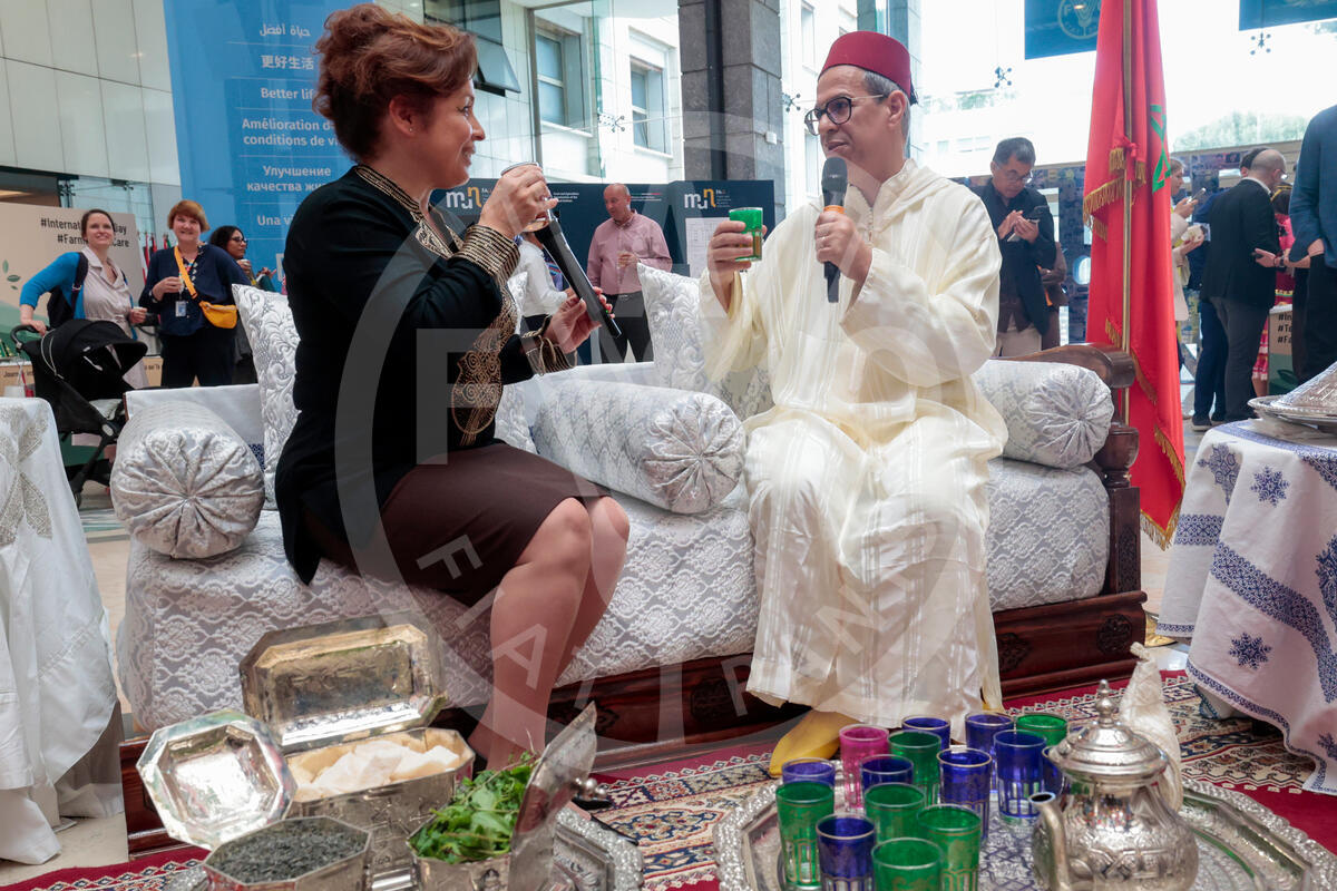 21 May 2025. Rome, Italy. Adbellah Larhmaid, Deputy Morocco ambassador talks to Araceli Cardenas, FAO Communications Specialist, EST. during the event “Teas from Around the World – Country Spotlights - (Kenya, Morocco, the Russian Federation)”, part of the celebration for the International Tea Day 2025. FAO headquarters, (Atrium).