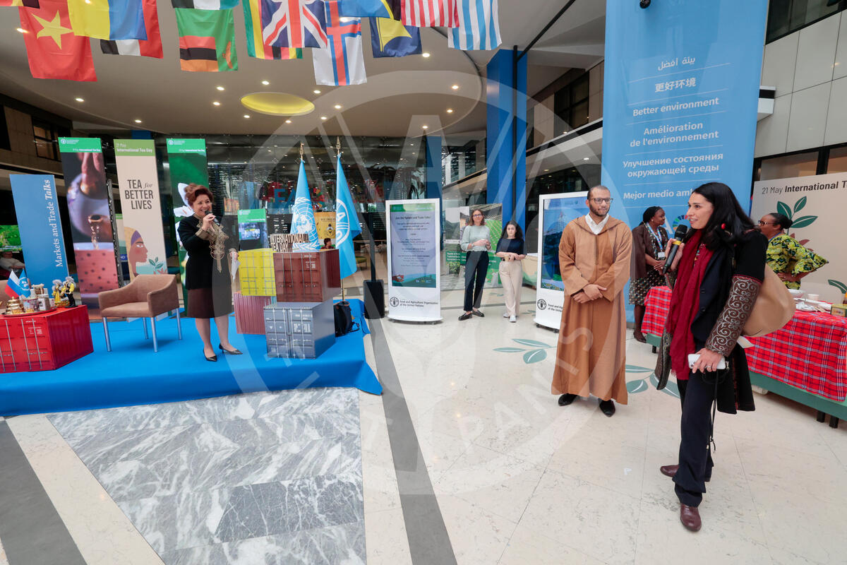 21 May 2025. Rome, Italy. A woman answers to a question about the use of tea in the world during the event “Teas from Around the World – Country Spotlights - (Kenya, Morocco, the Russian Federation)”, part of the celebration for the International Tea Day 2025. FAO headquarters, (Atrium).