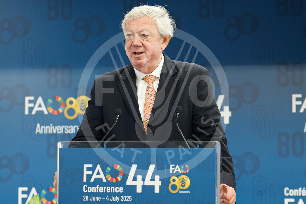 30 June 2025, Rome, Italy. Outgoing Independent chairperson of the Council delivers his address during the 3rd day of the 44th Session of the FAO Conference. FAO Headquarters (Plenary Hall).