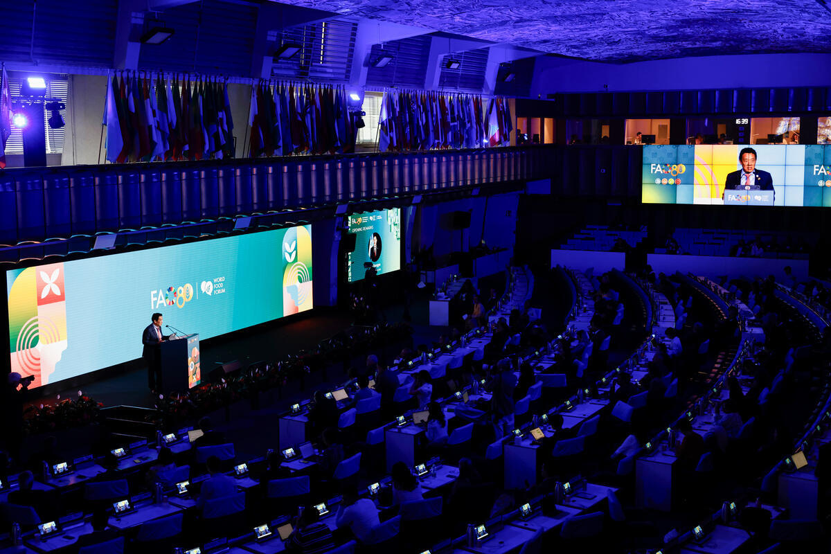14 October 2025, Rome, Italy. FAO Director-General QU Dongyu delivers his address during the Science and Innovation Forum Driving technologies and innovations towards equitable agrifood systems transformation: launching of ATIO (OIN). World Food Forum (WFF) 2025. The fifth edition of the World Food Forum (WFF), the largest annual gathering of agrifood systems stakeholders globally, runs at FAO headquarters in Rome from 10 to 17 October 2025. FAO Headquarters (Plenary Hall).
