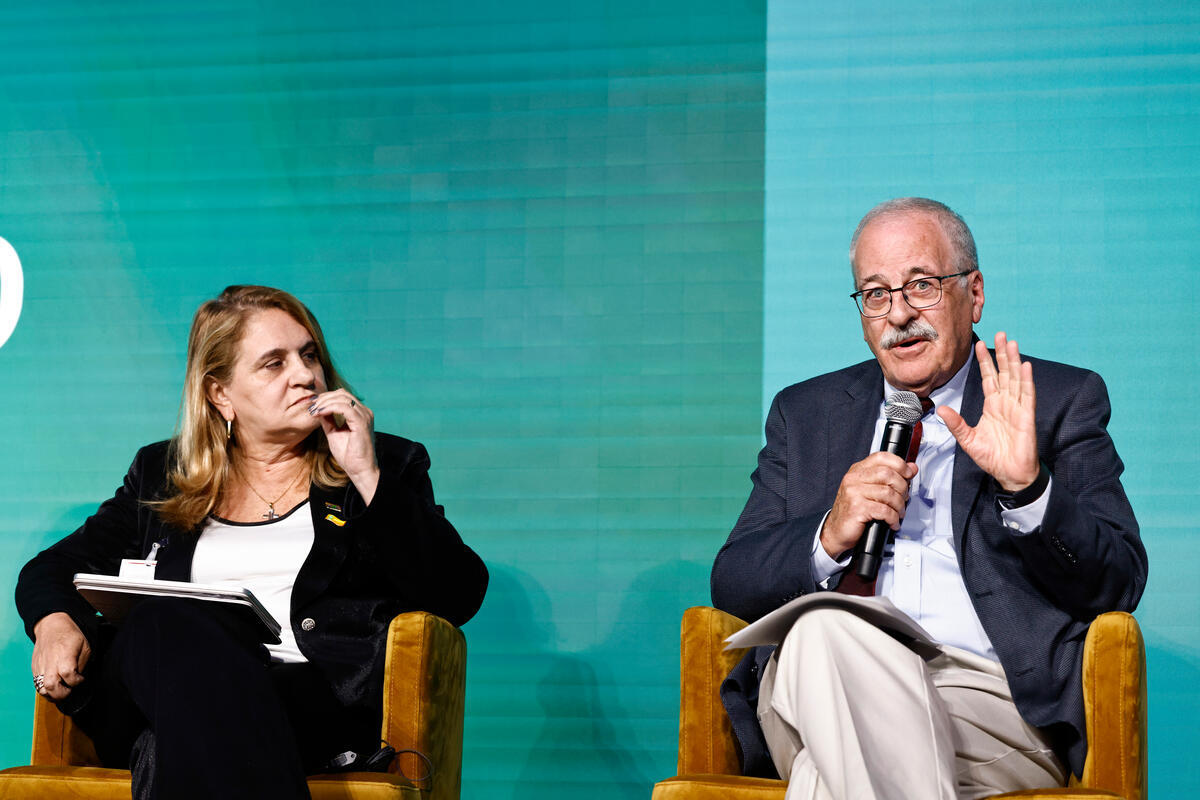14 October 2025, Rome, Italy. Silvia Maria Fonseca Silveira Massruha (L), President of Embrapa (Brazilian Agricultural Research Corporation) and Philip Pardey (R), Philip Pardey Professor of Science and Technology Policy at the University of Minnesota and Director of the GEMS Informatics Center, attend the Science and Innovation Forum Driving technologies and innovations towards equitable agrifood systems transformation: launching of ATIO (OIN). World Food Forum (WFF) 2025. The fifth edition of the World Food Forum (WFF), the largest annual gathering of agrifood systems stakeholders globally, runs at FAO headquarters in Rome from 10 to 17 October 2025. FAO Headquarters (Plenary Hall).