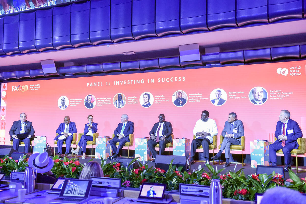 14 October 2025. FAO Headquarters, Rome, Italy. From left to right: Máximo Torero, Chief Economist of the Food and Agriculture Organization of the United Nations (FAO); Damian Ihedioha, Division Manager for Agribusiness Development at the African Development Bank (AfDB); Emeline Fellus, Senior Director for Agriculture and Food at the World Business Council for Sustainable Development (WBCSD); H.E. Manuel José Antonio Cacho-Sousa Velàzquez, Permanent Representative of Peru to the Rome Based Agencies; H.E. Hussein Abdelbagi Akol, Minister of Agriculture and Food Security of South Sudan; Sylvain Nafiba Ouedraogo, Deputy Executive Secretary of CILSS; Rafael De Córdova, CEO of Tiyapuy Foods; and Ivan Ivanov, Global Lead for Sustainable Protein Advisory and Innovation, speak during the first panel, “Investing in Success”, of the official Opening Ceremony at the Hand-in-Hand Initiative Investment Forum during the 2025 World Food Forum.