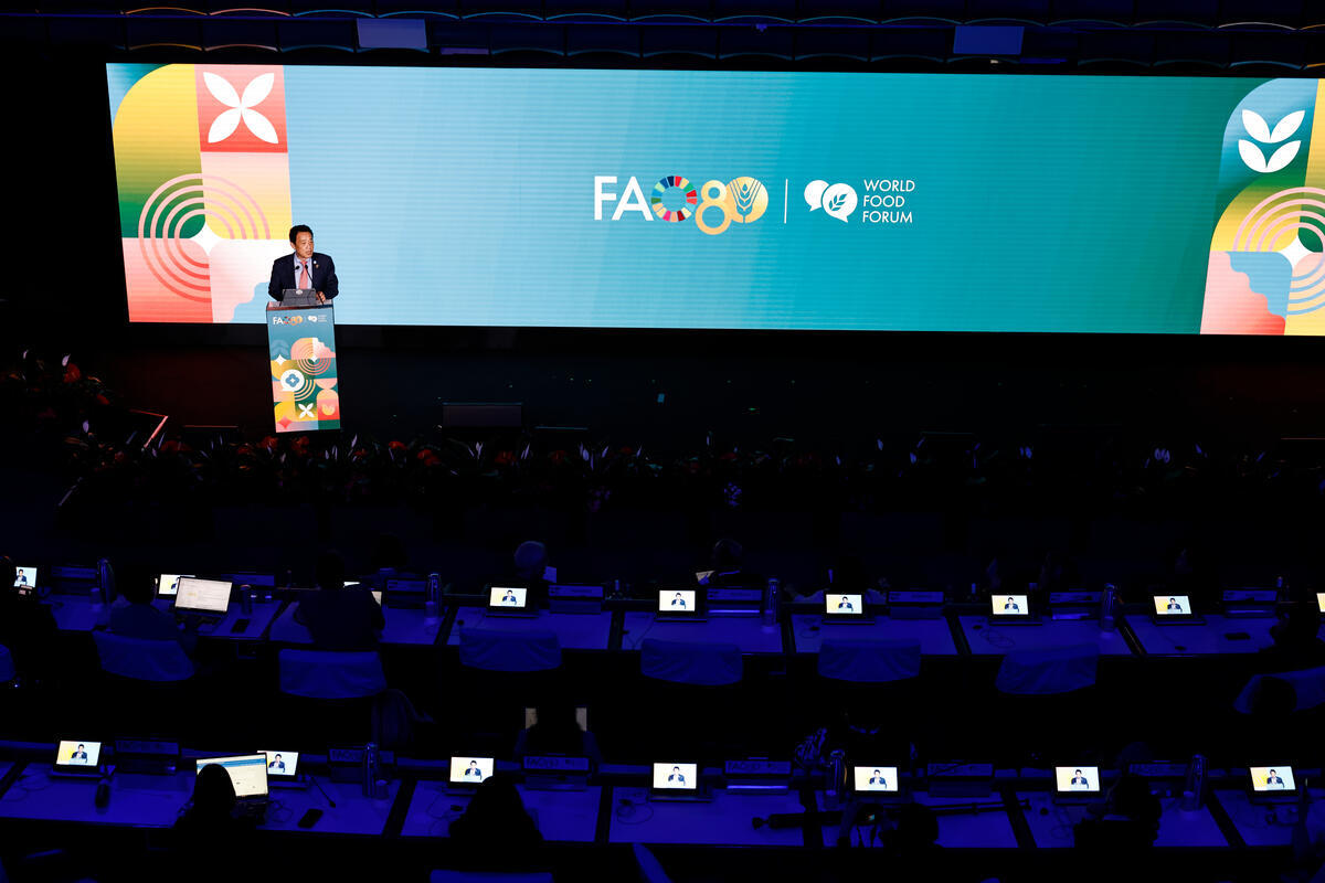 14 October 2025, Rome, Italy. FAO Director-General QU Dongyu delivers his address during the Science and Innovation Forum Driving technologies and innovations towards equitable agrifood systems transformation: launching of ATIO (OIN). World Food Forum (WFF) 2025. The fifth edition of the World Food Forum (WFF), the largest annual gathering of agrifood systems stakeholders globally, runs at FAO headquarters in Rome from 10 to 17 October 2025. FAO Headquarters (Plenary Hall).