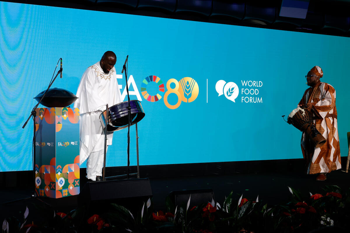 14 October 2025, Rome, Italy. Akinola (L) and Alpha Sennon perform during the session Science and Innovation Forum Driving technologies and innovations towards equitable agrifood systems transformation: launching of ATIO (OIN). World Food Forum (WFF) 2025. The fifth edition of the World Food Forum (WFF), the largest annual gathering of agrifood systems stakeholders globally, runs at FAO headquarters in Rome from 10 to 17 October 2025. FAO Headquarters (Plenary Hall).