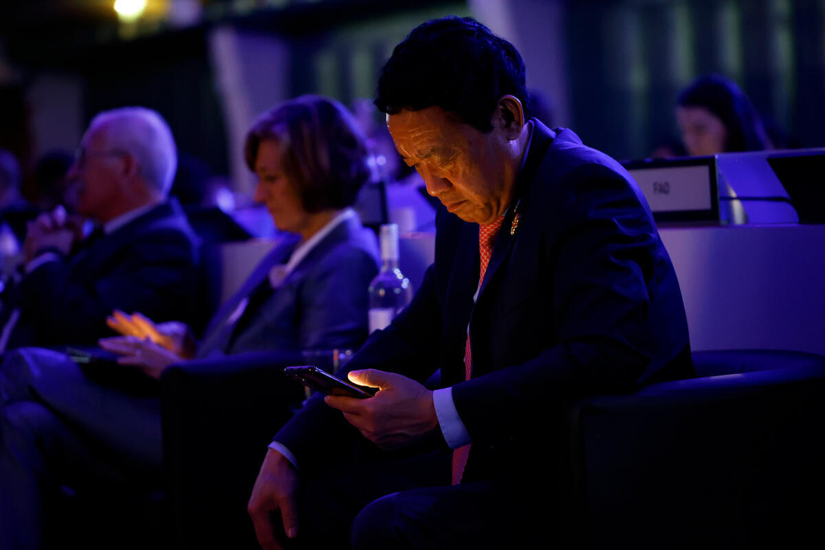 14 October 2025, Rome, Italy. FAO Director-General QU Dongyu checks his mobile during the session Science and Innovation Forum Driving technologies and innovations towards equitable agrifood systems transformation: launching of ATIO (OIN). World Food Forum (WFF) 2025. The fifth edition of the World Food Forum (WFF), the largest annual gathering of agrifood systems stakeholders globally, runs at FAO headquarters in Rome from 10 to 17 October 2025. FAO Headquarters (Plenary Hall).