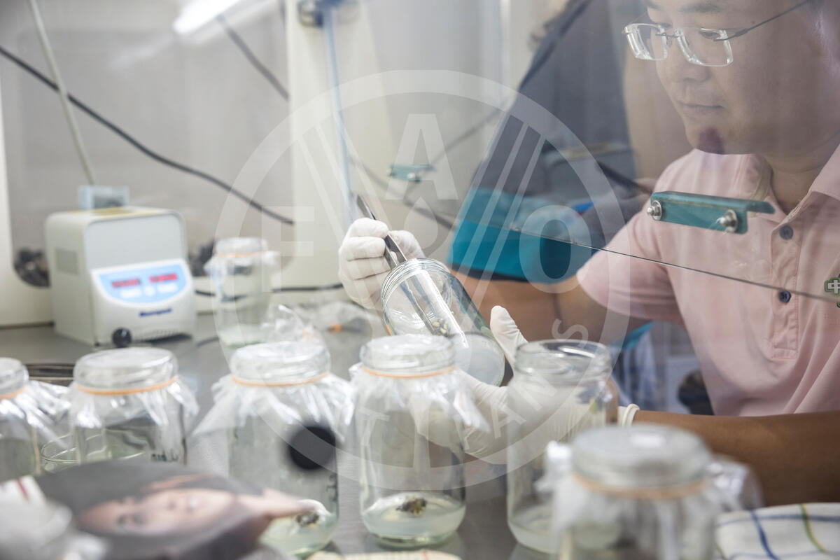 17 February 2025. Horana, Sri Lanka. Lijun Guo, a Chinese tissue culture expert, places banana and pineapple tissue in a liquid nutrient medium from which suckers will be grown in a plant tissue culture process at the Food Research and Development Institute.