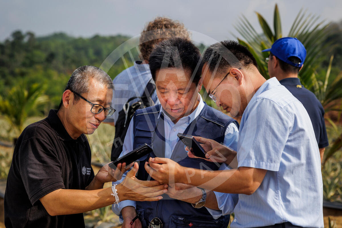 18 February 2025. Horana, Sri Lanka. Ye Anping (C), Director PST, with Jifeng Li (L) and Lijun Guo (R), Chinese agriculture expert advisors, during a visit to a pineapple farm that is receiving Chinese expertise and technological support.