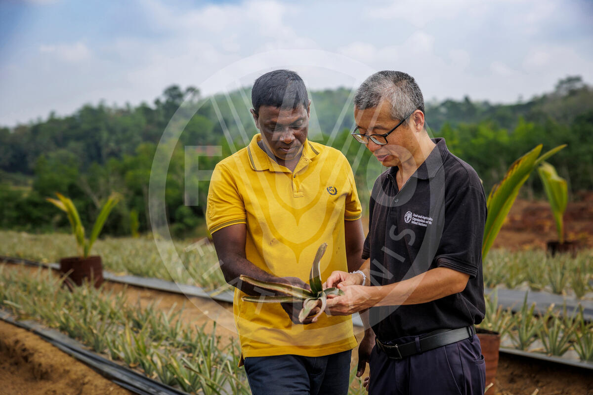 18 February 2025. Horana, Sri Lanka. BHS Lakmal (L), a pineapple farmer, inspects his crops, with Jifeng Li (R), a Chinese agriculture advisor who is providing Lakmal with expertise and Chinese technological support.