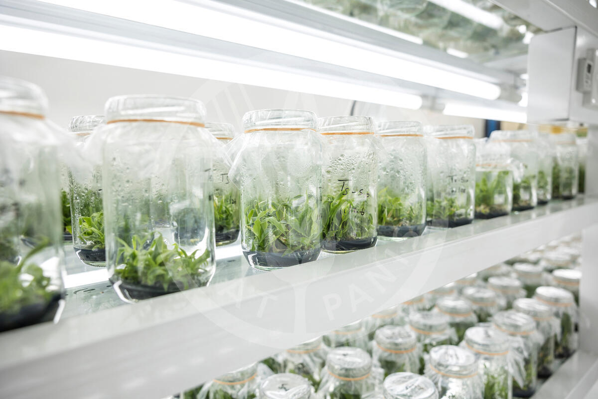 17 February 2025. Horana, Sri Lanka. Pineapple suckers growing in plant tissue culture at the Food Research and Development Institute. Jars lined up in controlled growing facility.