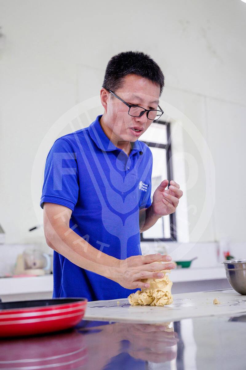 21 February 2025. Anuradhapura, Sri Lanka. Yangyang Liu, a Chinese advisor on value addition and food processing, kneads dough for pineapple cake at the National Institute of Post Harvest Management.