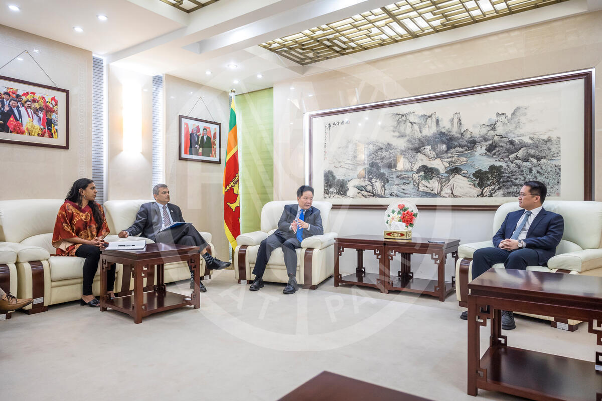 17 February 2025. Colombo, Sri Lanka. The UNFAO PST delegation, (L-R) Athifa Ali, Project Officer, South-South and PST, Vimlendra Sharma, UNFAO Representive, Sri Lanka and the Maldives, and Ye Anping, Director South-South and PST, meets Zhu Yanwei, Chargé d' Affaires of the Embassy of China in Sri Lanka.